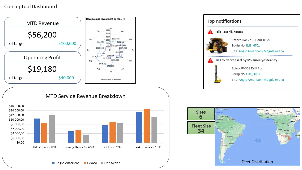 The Heavy Equipment Operations Hub is a single application, with add-on features, enabling OEM manufacturers & distributors to implement servitization models for their customers based on actual KPI measurement of equipment performance, utilization and operation metrics.